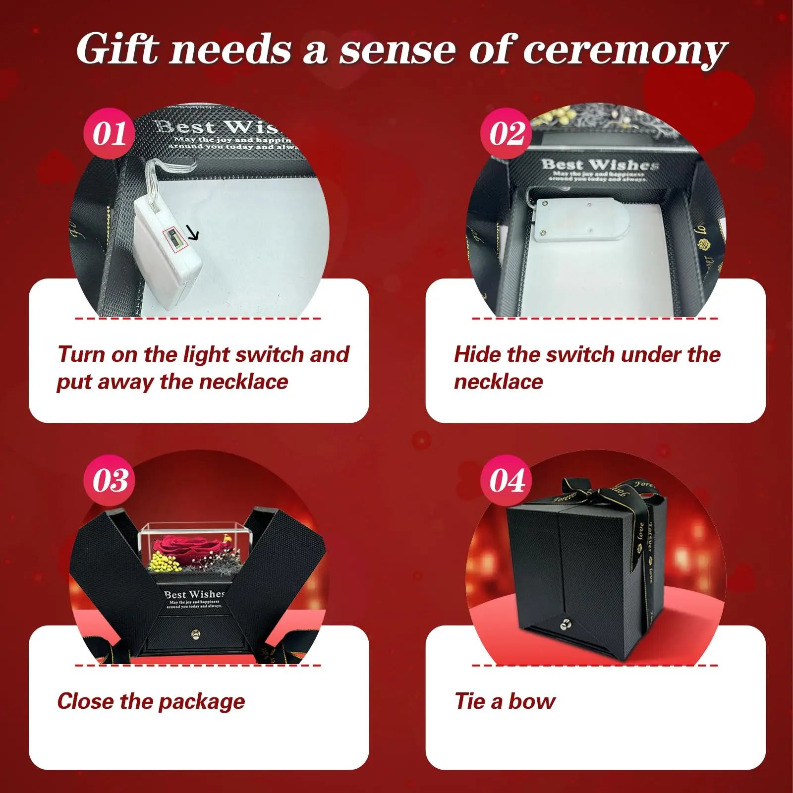 Eternal roses: Eternal roses are made from all-natural flowers and kept in a unique way for 3-5 years. No pollen. No need to water. No maintenance required. The roses are surrounded by a light atmosphere, making the gift look more romantic and ceremonial